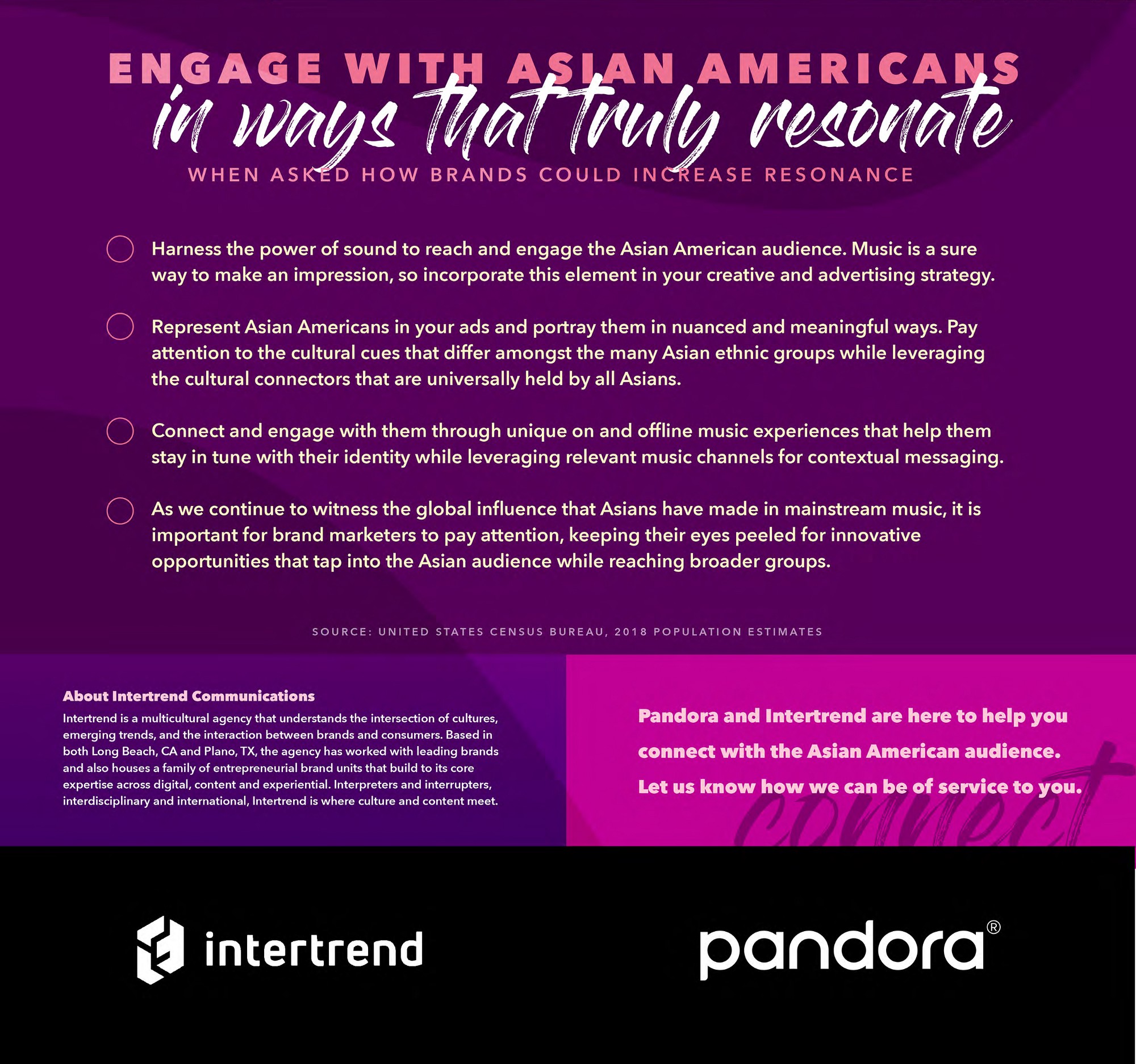 Pandora and Intertrend are here to help you connect with the Asian American audience. Let us know how we can be of service to you.