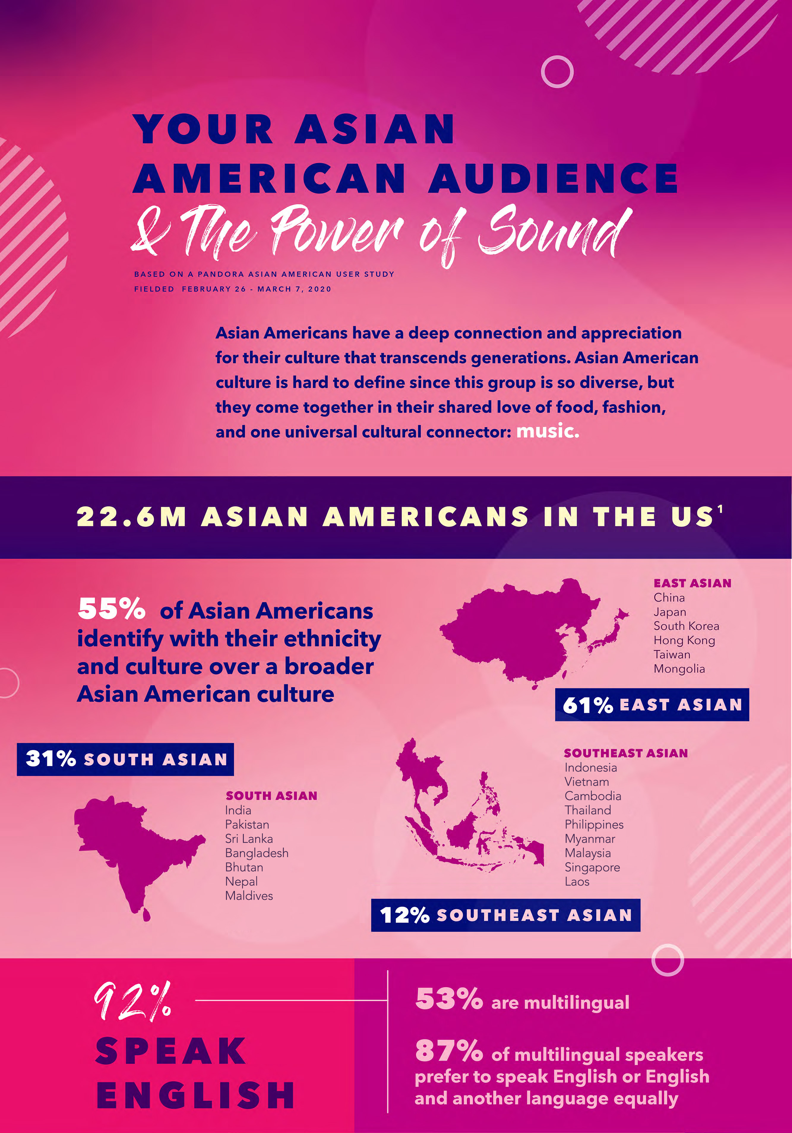 “There is no doubt that the power of music can offer comfort, inspiration, and create community. Pandora conducting the Asian American User Study with Intertrend further reinforces that. As we continue to see people of all ethnicities groove to the beat of K-Pop, Bollywood, C-Pop and Japanese Techno, it is hard to find a more powerful cultural connector than music that transcends all racial barriers.” — Julia Huang, President & CEO ofIntertrend Communications